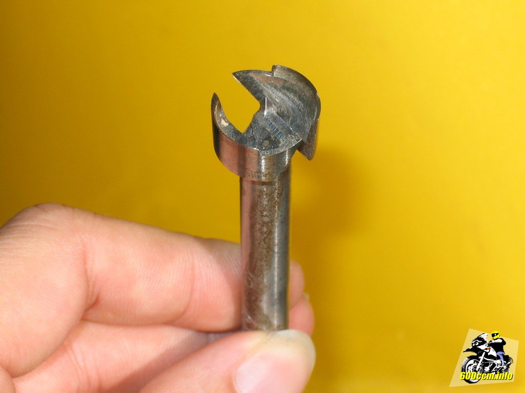 Wer wie ich die Verkleidung nicht abbauen kann oder will, hängt ein wenig länger über der XJ 600 mit abgenommener Sitzbank. Ein Akkuschrauber passt zumindest nicht zusammen mit einem langen Forstnerbohrer in das Ablagefach. Daher habe ich zunächst mit einem 4 mm Holzbohrer gebohrt und dieses Loch anschließend mit einem 10 mm Bohrer vergrößert. Vorher natürlich unbedingt anzeichnen wo man die Bohrung haben möchte, damit danach auch noch die oben bereits erwähnte Verstrebung noch vorhanden ist. ![]()