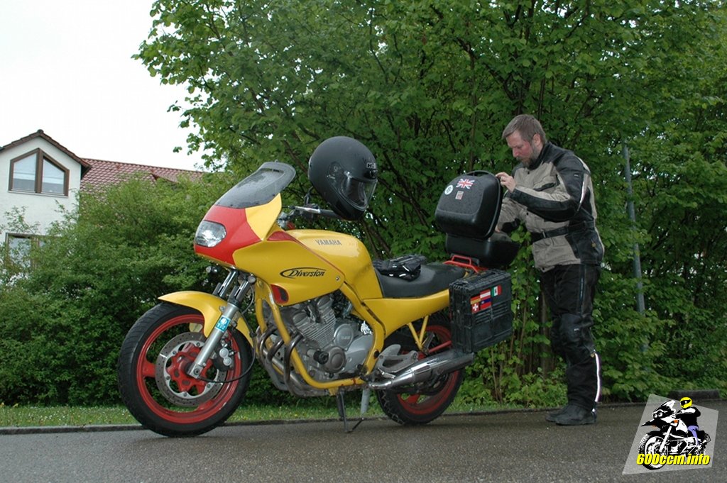 Unter der Plane hat sie die letzten 4 Wochen verbringen müssen. Also runter mit der Plane, rein in die Kombi und rauf auf die Sitzbank. Tja... Und hinein in diverse Arten von Niederschlägen. Leichter Regen, stärkerer Regen und ganz kurz auch mal gar kein Regen.