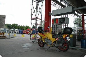 Nun denn... So stand ich dann rund 220 km beziehungsweise knapp über drei Stunden später an einer Tankstelle. Abstellen, Absteigen – und dabei feststellen, dass es für das erste Mal wohl etwas zu viel war. Meine Knochen sind noch nicht wieder daran gewöhnt so lange auf einer Sitzbank zu sitzen.
