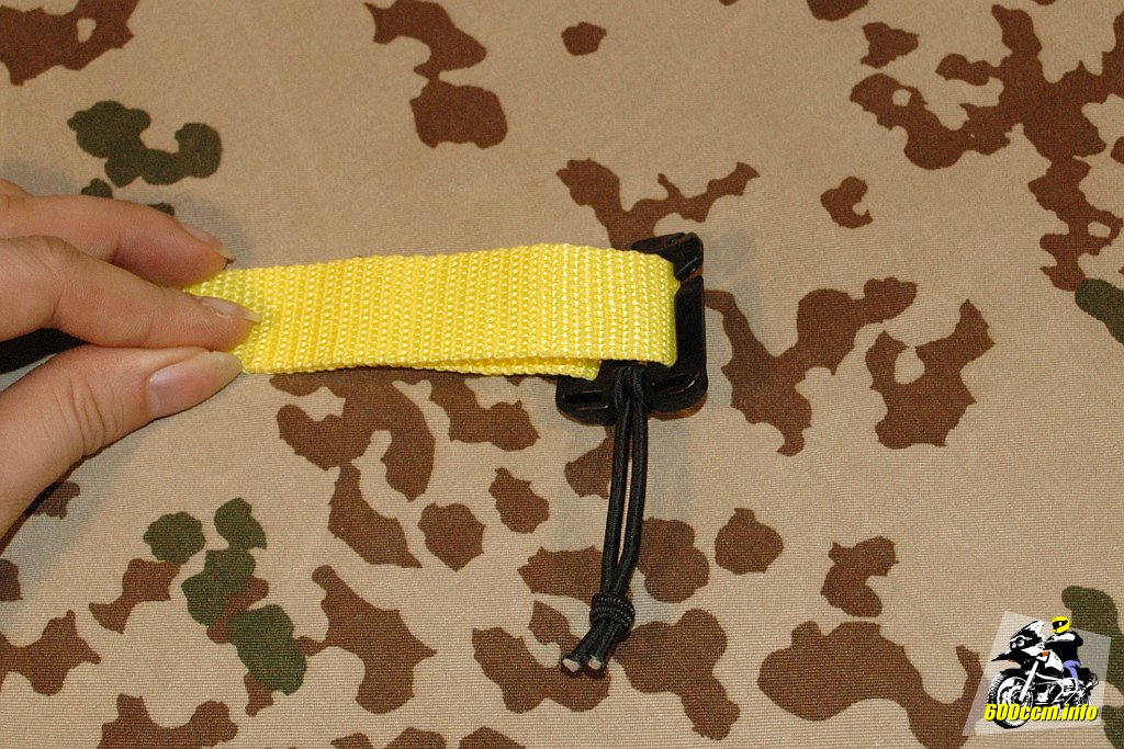 Der Web Dominator hat ein klares, einfaches Design und besteht einem kleinen Kunststoff-Clip (passend zu MOLLE) und einem Stück elastischer Schnur. Einfach das überschüssige Gurtband aufrollen und mit dem Clip befestigen, fertig. Eigentlich genial, aber es kann auch falsch verwendet werden – was man leider im Web auch gelegentlich sehen kann.