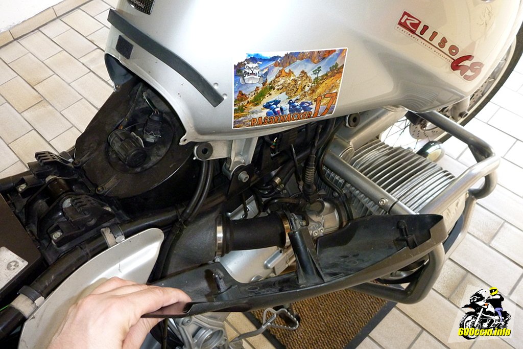 Die Schraube muss herausgedreht werden, denn die Halterung am Ansaugschnorchel ist als rundes Loch ausgeführt. Nach dem Entfernen der Schraube hatte ich jedoch eine kleine Überraschung vor mir.