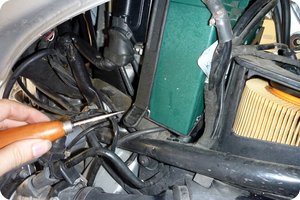 Dort, wo der Ansaugschnorchel abgenommen wurde, befindet sich die Öse des Gummibands. Die Batterie wird gegen Verrutschen mit diesem Gummiband geschützt.