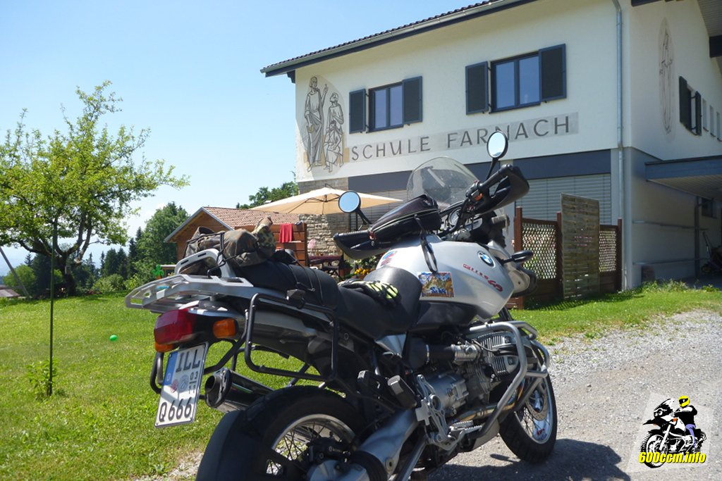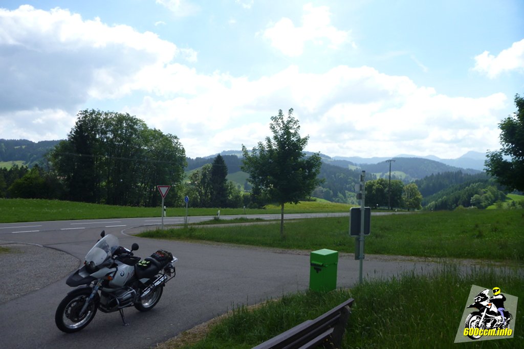 Während ich die Sachen an meiner GS wieder sortiere und mich zur Weiterfahrt vorbereite, zieht ein SUV mit Pferdeanhänger hintendran an mir vorbei. Ausgerechnet in die Straße, welche ich nun weiter zum Nachweispunkt auf dem Pfänder nehmen werde. Na, dann warte ich einfach noch zwei, drei Minuten. Dann wird der schon weg sein.