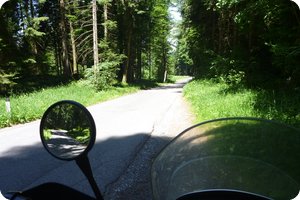 Ich lasse mir Zeit beim Fahren, versuche diesmal auch Panoramaaufnahmen zu machen. Leider klappt es nicht immer, leider auch nicht an der kleinen Bank direkt nach dem zweiten Schild von Ettensbach in Fahrtrichtung Diepolz. Daher einfach zwei Impressionen wie die Straßen dort aussehen. Vielleicht lässt sich damit ein wenig nachfühlen was mir so gut an der Ecke gefällt: Schmale Straßen, welche sich die Hügel hoch und wieder hinunter winden. Zwischendurch kurze Passagen durch Wälder, in denen ich das Sonnenvisier zurück in den Helm fahren lassen kann.