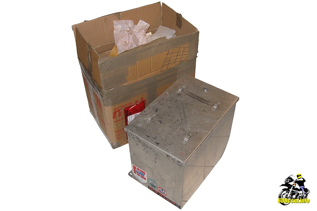 Zusätzlich mit Papier gepolstert kommt nach dem Öffnen des ersten Kartons der erste der beiden Seitenkoffer langsam zum Vorschein. Auf dem Deckel sieht man schon die ersten Gebrauchsspuren, welche sich in Form von ins Aluminium eingearbeiteten Striemen vom Spanngurt darstellen.