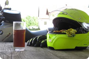 Der Wirt vom Gasthof Löwen erkannte mich und meine BMW wieder. Vielleicht lag es ja auch am gelben Helm? Jedenfalls kehrte ich auf zwei Spezi ein und saß nicht lange alleine am Tisch. Nach wenigen Minuten gesellte sich ein vespafahrendes Ehepaar zu mir und man sprach über die gute, alte BMW-Zeit von R 80 RT und wie sich doch alles inzwischen weiterentwickelt hat.