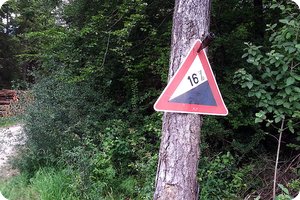 Das Navi kannte die Straße nicht. Ein an einen Baum gezimmertes Schild verriet »hier geht es abwärts«. Was die Bierflasche für eine Geschichte erzählen könnte ist mir jedoch nicht bekannt.