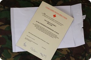 Ich habe spät angefangen, dann kamen noch ein paar Unterbrechungen wegen Impfungen und Zahnreinigungen dazu. Aber nach rund vier Jahren habe ich jetzt die Ehrennadel für 10 Blutspenden bekommen.