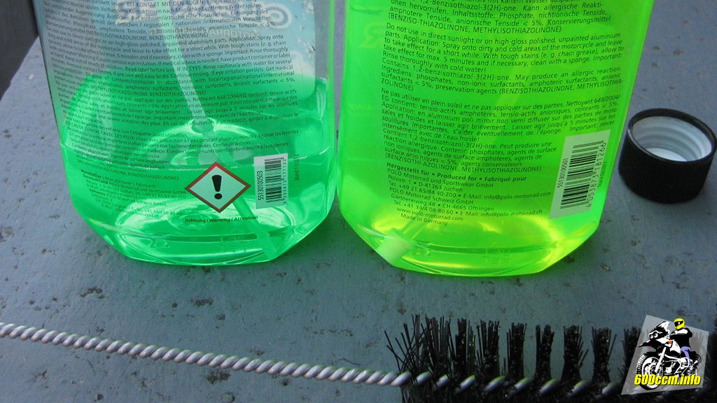 Mit auf dem Bild ist noch der BikeCare Motorradreiniger, ebenfalls von Polo vertrieben. Der ist allerdings deutlich dünnflüssiger und kam heute nicht zum Einsatz. Ich wollte die Flasche aber trotzdem mit ins Bild nehmen damit man sieht, dass Polo tatsächlich zwei unterschiedliche Reiniger im Sortiment hat (oder zumindest hatte) – und beide sind grün.