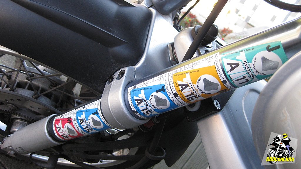 Wie man sieht: Die Vignetten kleben auch noch. Obwohl teilweise schon über drei Jahre lang auf dem Standrohr klebend und sie bereits mehrere Reinigungen über sich haben ergehen lassen.
