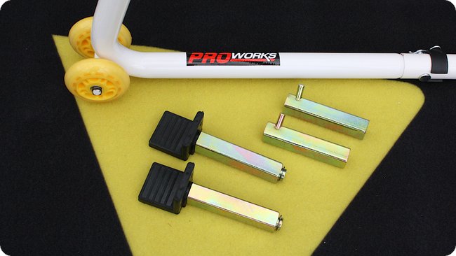Die Bezeichnung »2 in 1« spielt darauf an das der Montageständer sowohl für das Vorderrad aber auch für das Hinterrad verwendet werden kann. Eigentlich ist es sogar ein »2 in 1«-Montageständer, denn es liegen drei unterschiedliche Aufnahmen für die Verwendung am Motorrad bei: Frei drehende, gummierte Aufnahmen für den Einsatz an der Schwinge, Dornaufnahmen für den Einsatz an der Gabel und sogenannte »V-Schnellaufnahmen« für den Einsatz in Verbindung mit »bobbin pins«.
