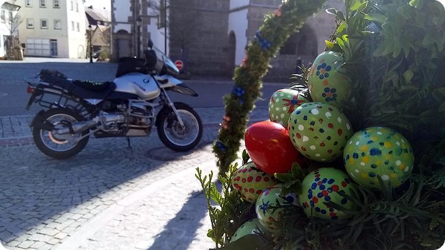 So... Die Planung für den Odenwald läuft, wünscht der BMW und mir genausoviel Glück mit dem Wetter. Ich freue mich jedenfalls schon auf die Straßen im Odenwald. Letztes Jahr war ich von dem fast ausnahmslos makellosen Fahrbahnbelag mehr als entzückt. Wenn es mich weiter nach Hessen oder Bayern hinein treiben sollte hoffe ich das sie dort auch so schön in die Infrastruktur investiert haben und dort nicht nur viele Osterbrunnen zu entdecken sein werden.