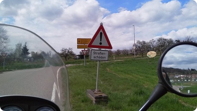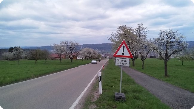 Die Sonne will auch wieder mitmischen, vorne wieder deutlich mehr Blau als zuvor, im Rücken die grauen Wolken – und am Straßenrand mal wieder eines der gefühlt 2'391 Schilder von wegen »Straßenschäden«. Nach dem 50. Schild habe ich aufgehört mitzuzählen, vielleicht waren es auch unter 2'000 Schilder und ich habe gerade maßlos übertrieben.