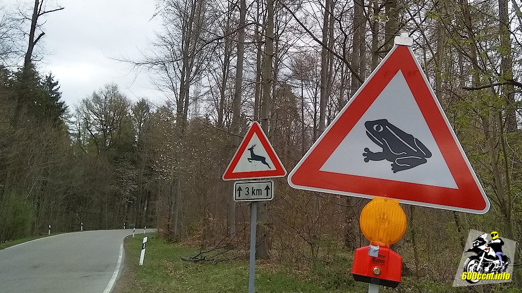 Aber es gab nicht nur die Hinweise zu den Straßenschäden. Damit es nicht zu eintönig wird kamen zu den gefühlten 2'391 Schildern mit Straßenschäden noch mal etwa 539 Schilder welche vor wild marodierenden Kröten gewarnt haben. Da die Kröten sich allerdings streng an die Sommerzeit halten: Nur zwischen 19 und 6 Uhr sind sie auf den Straßen unterwegs. Garantiert!