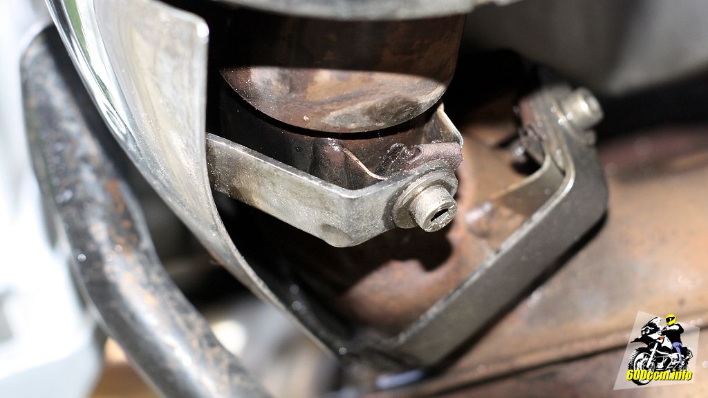 Beide Schrauben werden durch den Ausleger für die Soziusfußraste geführt. Eine oben, an welcher ab 06/2000 der Endschalldämpfer ebenfalls verschraubt wird. Die untere Schraube entfällt bei der veränderten Aufhängung vom Endschalldämpfer.