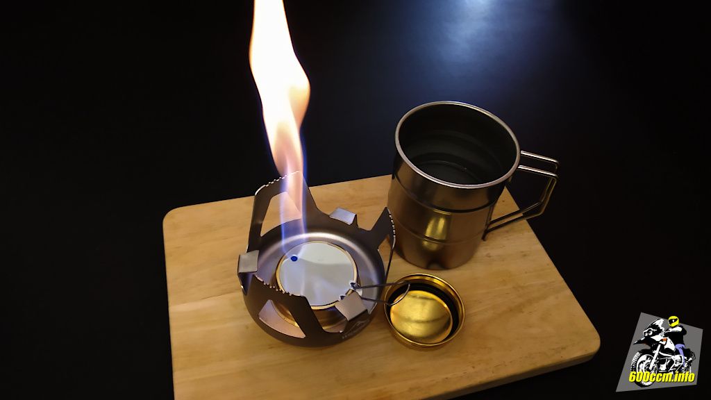 Ich habe dem Brenner ein wenig Zeit gegeben, bevor ich die Tasse mit den 250 ml Wasser auf das Aluminium-Gestell platziert habe. Noch war die Flamme recht niedrig und zahm, das sollte sich aber ändern.