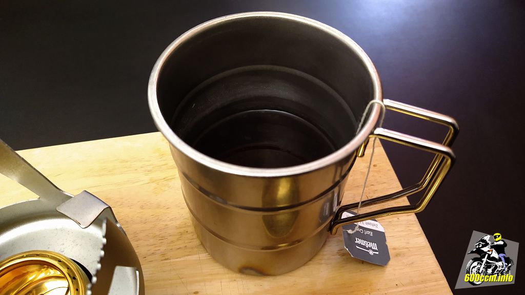 Die Flamme war noch immer unscheinbar und zahm und begann langsam die Edelstahltasse samt Wasser darin zu erwärmen. In der Zwischenzeit habe ich den Teebeutel aus der Pappverpackung geholt und für den Wurf ins kochende Wasser bereit gelegt.
