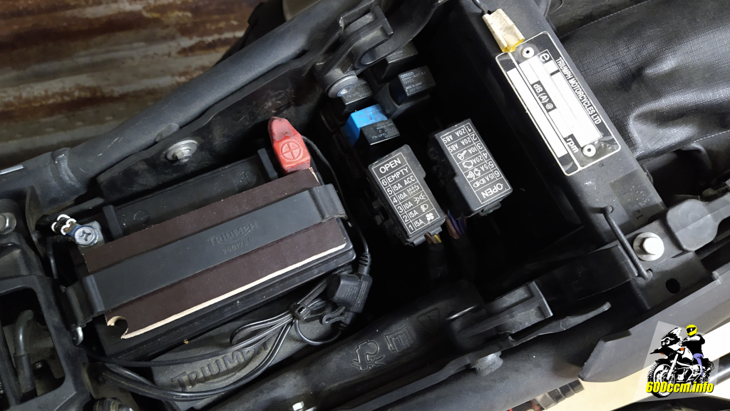 Die Tiger 800 hat zwei Sicherungskästen unter der Sitzbank. Der vordere, auf dem Bild linke Sicherungskasten hat unter anderem die Sicherung für die Bordsteckdose(n) der Tiger 800. Bei meiner »Road« von 2011 gibt es nur eine Bordsteckdose, andere Modelle der Tiger 800 können bis zu drei Bordsteckdosen haben.