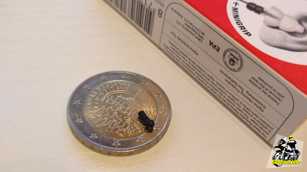 Was da auf der 2-Euro-Münze liegt ist etwa die Hälfte von einem der beiden »Minigrips«. Ich konnte den Stöpsel trotzdem noch gut aus dem Ohr ziehen, ich habe dafür die Einführhilfe genutzt und dann damit den Stöpsel aus dem Ohr bekommen.