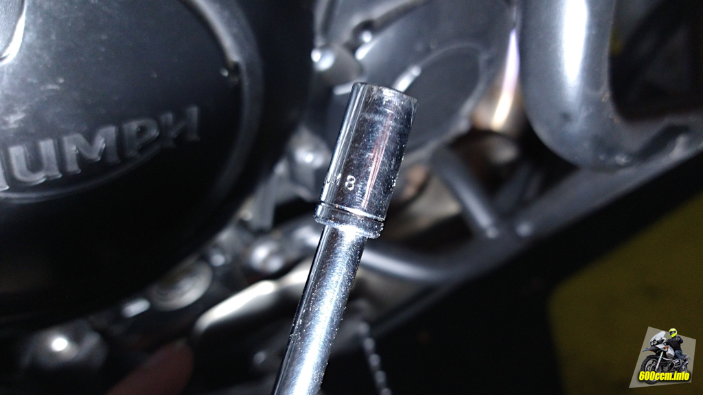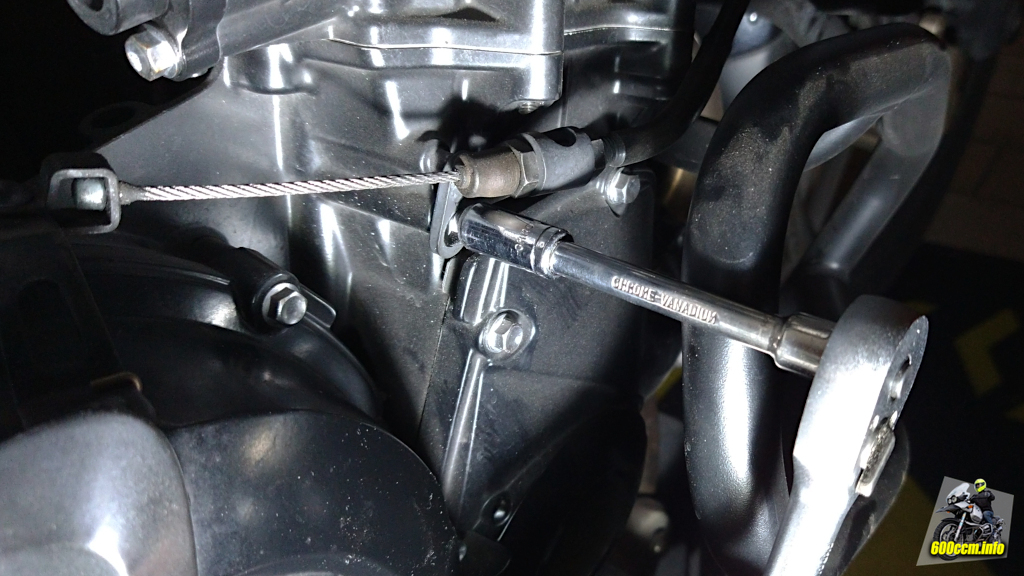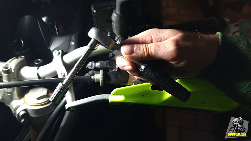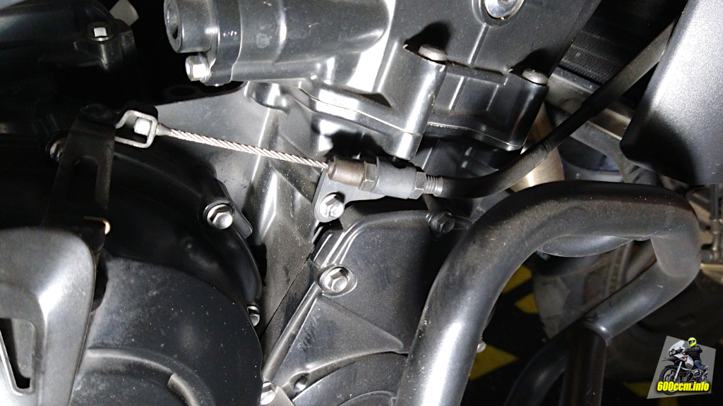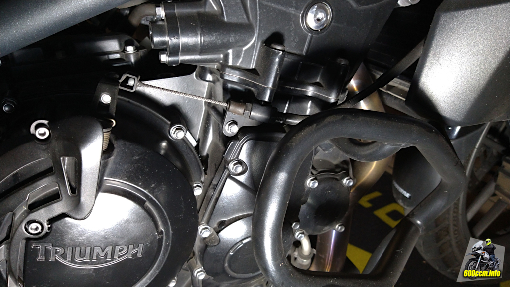 Bei der Tiger 800 lässt sich dies einfach bewerkstelligen. Unten im Bereich der Kupplung befindet sich die Führung für den Bowdenzug. Wird mit dem 8 mm Innensechskant-Steckschlüssel diese Führung vom Motorblock gelöst, hat der Bowdenzug keine Spannung mehr.