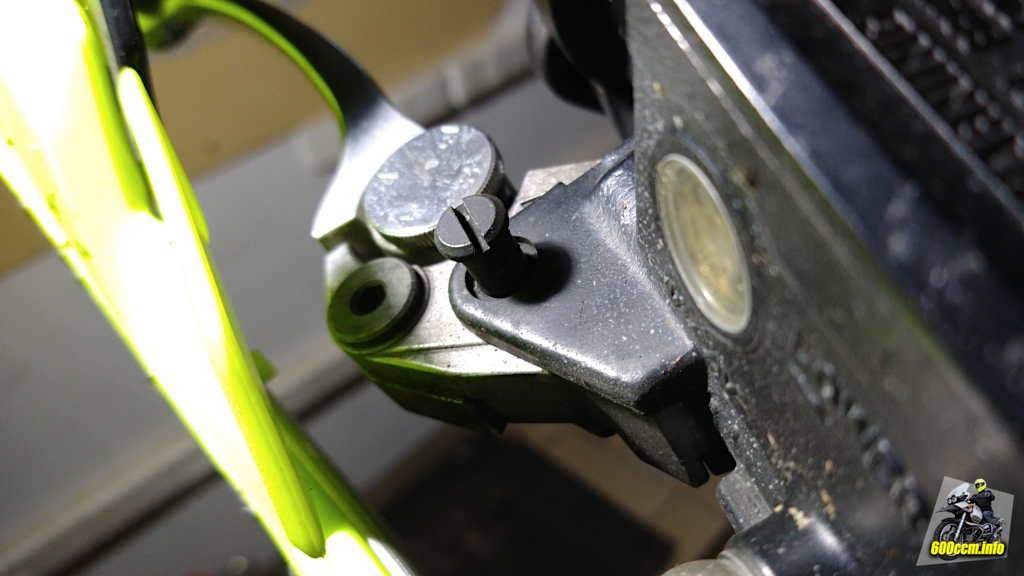 Während der Bolzen des Kupplungshebels sich selbst arretiert hat, wird für die Demontage des Bolzens des Bremshebels der Schlitz-Schraubendreher benötigt. Der Rest ist gleich, mit dem 10 mm Innensechskant-Steckschlüsseleinsatz und der kleinen Knarre ist die Mutter schnell entfernt.