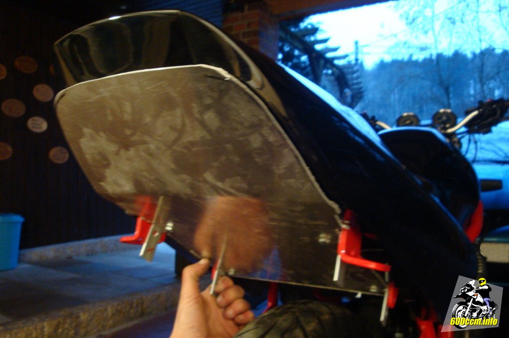 Da ich mich entschieden habe, die original Gepäckträgeraufnahmen als Halter für meine Verkleidung zu verwenden, gaben diese auch die Maße der Verkleidung vor. Gemessen wird von der vorderen der beiden Aufnahmen, bis um die Biegung der Seitenverkleidung herum bis zum oberen Ende der, nun nicht mehr vorhandenen, Rückleuchte.