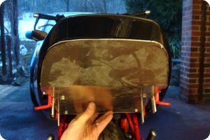 Als nächstes hab ich mir Markierungen an das Blech gezeichnet, genau dort, wo die Aufnahmen des Gepäckträgers sind. Diese habe ich erst einmal nur grob ausgeschnitten und immer genügend Material übrig gelassen. Bis das Blech sich zwischen die Halter sauber einfügt, habe ich in kleinen Schritten das Blech immer weiter angepasst. Immer daran denken: Wenn einmal zu viel Material weg ist, muss wieder von vorne begonnen werden. Auch hier kann eine Schablone aus Pappe hilfreich sein.