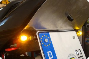 Natürlich sind die LED auch bei Tageslicht gut zu erkennen und erfüllen die von ihnen abverlangte Funktion voll und ganz. Ich bin schon ein wenig gespannt wann die erste Polizeikontrolle ihre Probleme mit der Konstruktion haben wird. Aber: Es ist alles legal. Der Mindestabstand zwischen den beiden Blinkern wird schon alleine durch die Maße vom Kennzeichen eingehalten (mindestens 180 mm) und zwischen Rücklicht und Blinker gibt es keinen Mindestabstand[5]. Gemäß StVZO beträgt der Mindestabstand zwischen den Blinkern hinten 240 mm.